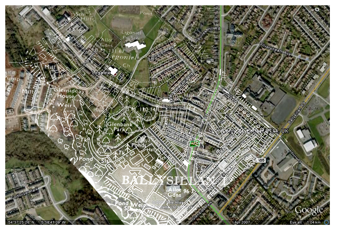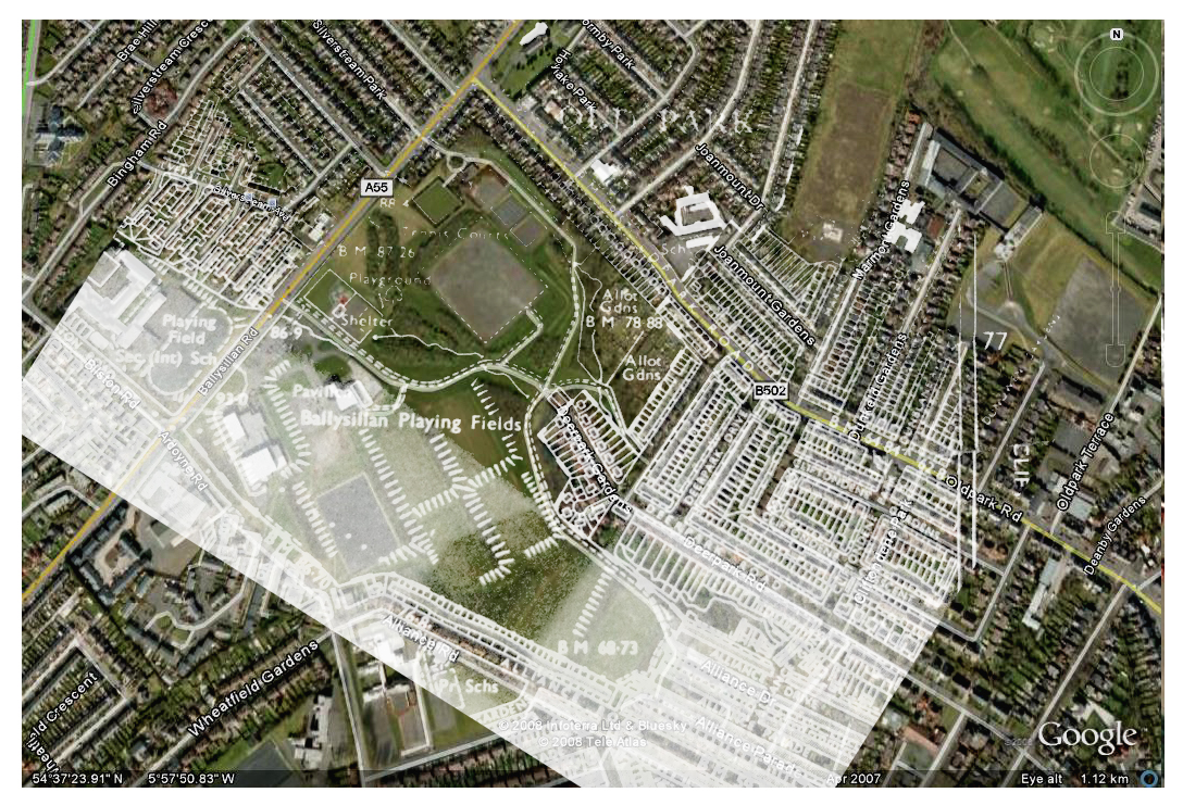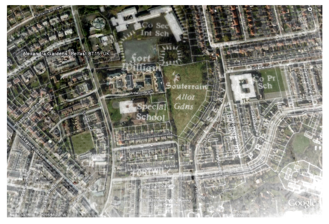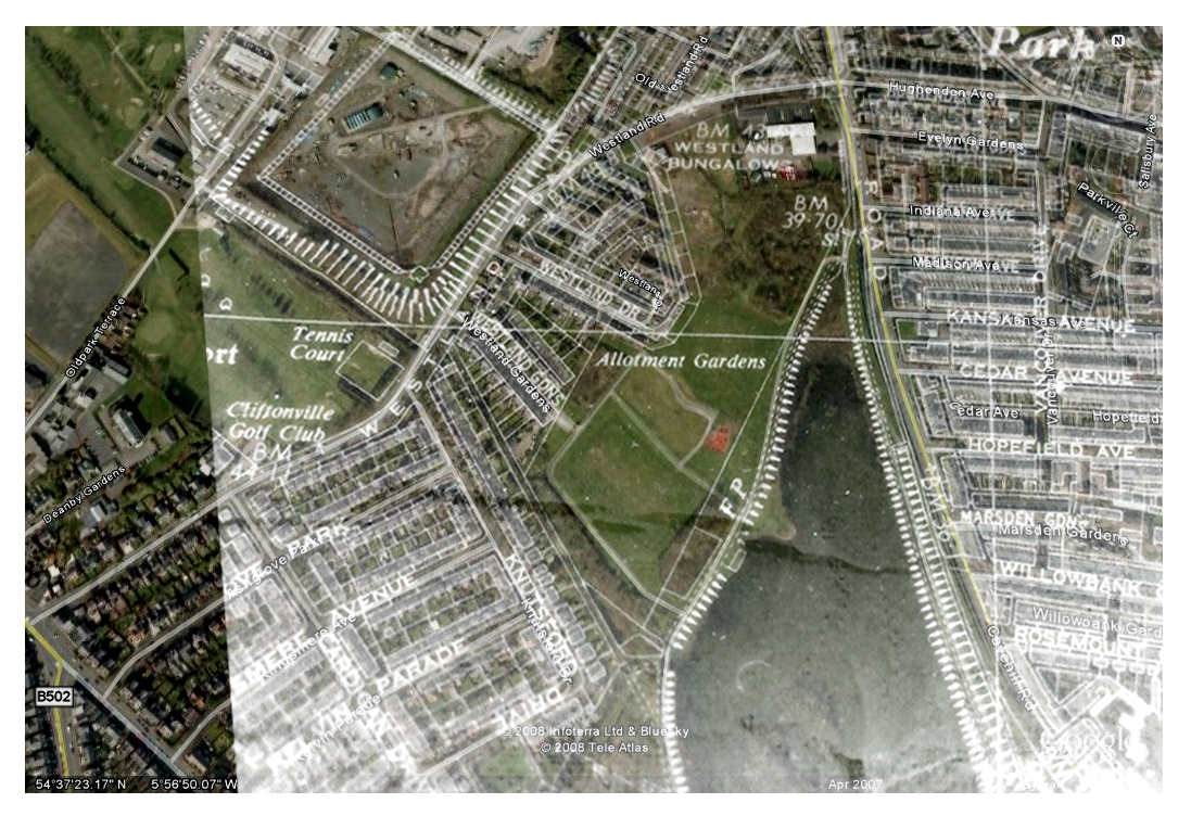 Its been a long time since I posted anything here but I recently came across this set of images which I produced during my time living in Belfast around 2008/9. At the time I was interested in community gardens and having heard that there were many so called victory gardens in the city during World War 2 and after, I visited the Belfast Central Library in search of old city maps. After taking some photos of the maps I overlaid the images on top of Google Maps and proceeded to visit the locations to see what is there today and how things have changed. Some of the gardens such as those on the Ardoyne road still exist while others have long since been paved over or built upon. However there are a few that are simply empty fields and I’m curious whether those same communities would have an interest in reclaiming such spaces. A project worth revisiting perhaps?