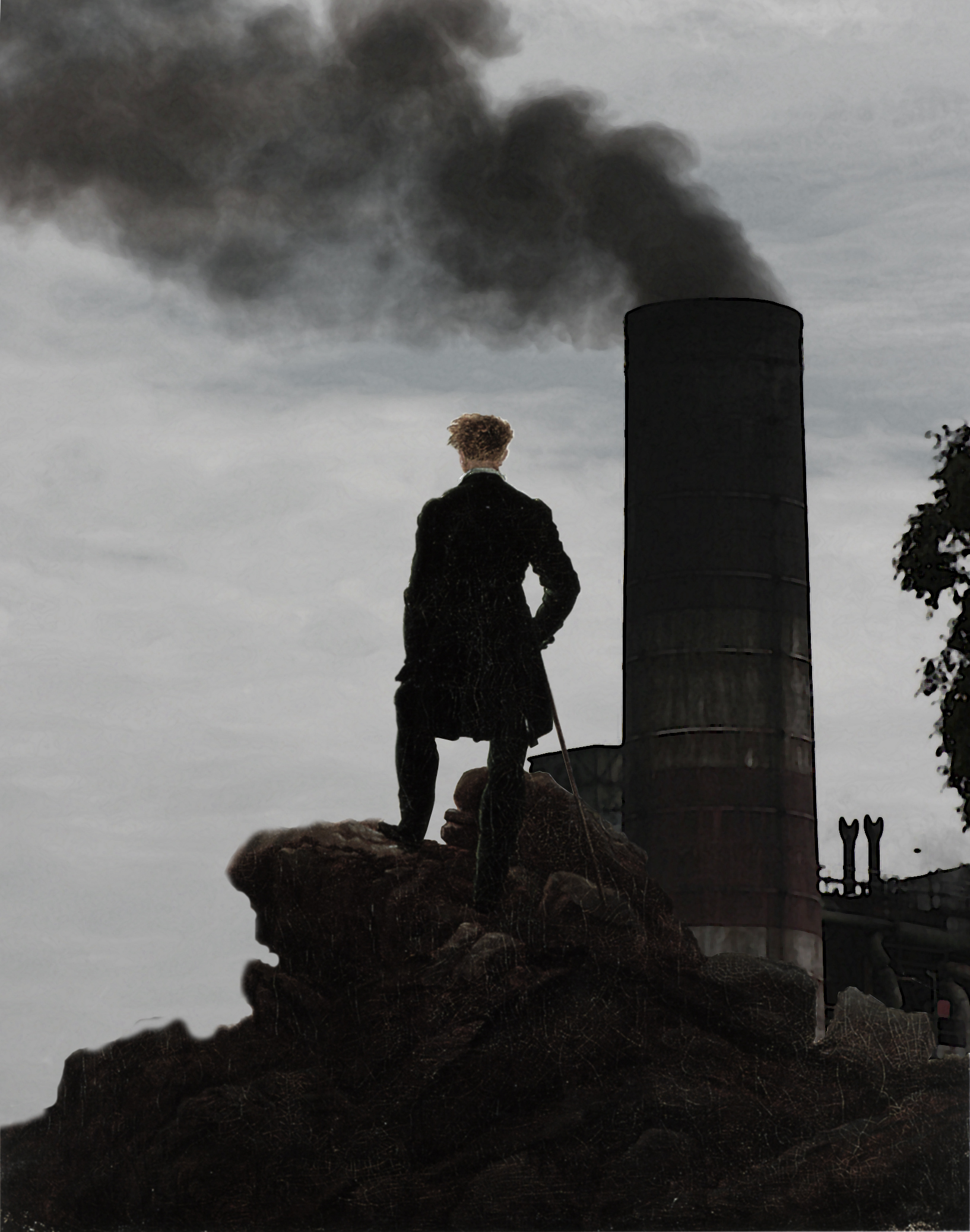 Another few images that have been sitting on my hard drive forever. Reflecting on Romanticism and the Environmental movement I did these collages of the work of the painter Caspar David Friedrich,  “Wanderer above the Sea of Fog” from which I took the figure in the foreground and placed against the “The Sea of Ice”. I’ve forgotten now where the background with the smokestack for the second image came from unfotunately. I like that this iconic lone romantic figure can be cut out and placed against different backgrounds bringing a reflective and comtemplative mood to the environment.