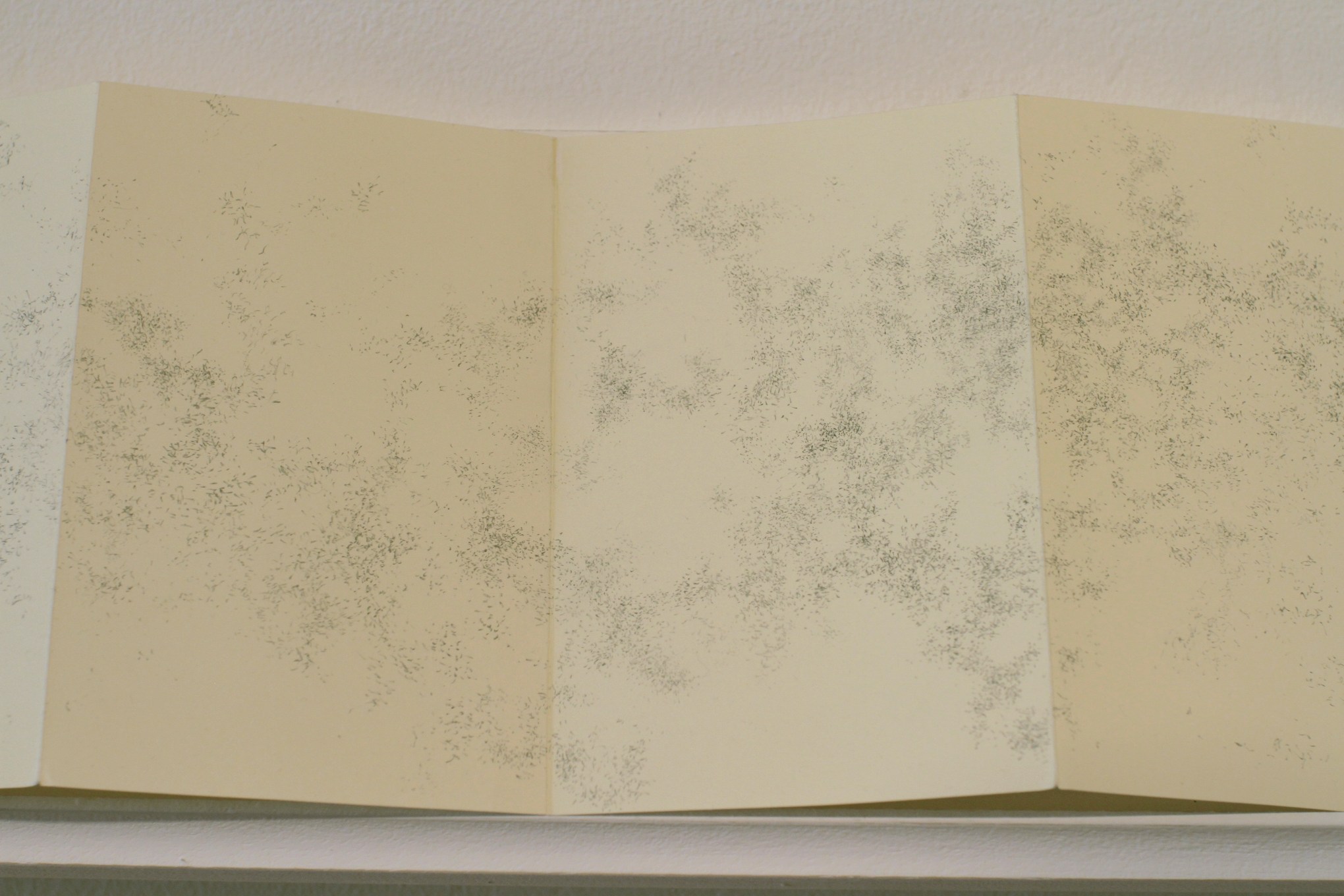 I draw in an abstract style, lightly working up patterns with pencil that are suggestive of ephemeral forms, like rain, clouds, or leaves rustling in the wind. The style is influenced by my interest in Zen Buddhism, the loose somewhat random process of mark making, a play between form and formlessness. The drawing above is a section from a Moleskine Japanese accordion style notebook, this enabled me to draw a continuos piece that is over three metres in length when opened fully. The notebook was exhibited in 2010 at the Galway Arts Centre as part of my first solo exhibition ‘This Floating World’.
