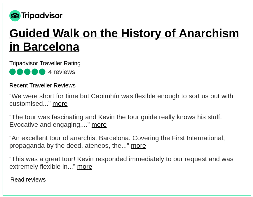This guided walk offers an introduction to the history of Anarchism in Barcelona, and the people and events that shaped it. It explores the historic evolution of anarchism and the anarchist movement. From the 1860s through to the 1930s, up to the outbreak of Spanish Civil War and the anti-fascist defence of Barcelona in July of 1936.