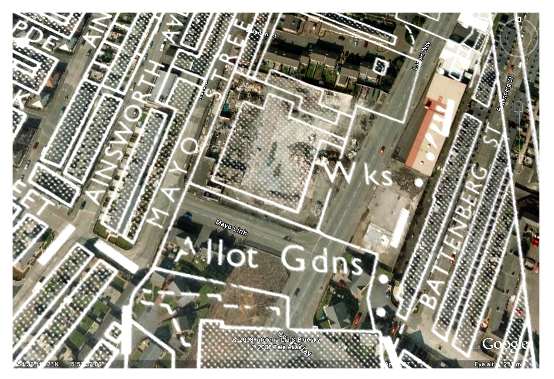 As part of my research for the project, I spent some time at the Belfast Central Library looking through old maps of the city. In times of crisis, people look for other means to provide for their needs. I had read somewhere that there were many allotments, so-called victory gardens, planted in the city during World War 2. After taking some photos of the old maps, I overlaid the images on top of more recent images from Google Maps. I set out on my bike to visit the locations to see how things had changed. Some gardens still exist, such as at the Waterworks and on the Ardoyne road, while others were turned into sports grounds, or paved over and built upon. Curiously, there were a couple of sites that were simply left as empty fields, with potential for local communities to reclaim those spaces. At that time, I had no way of knowing who owned those sites. Interestingly, a more recent project, https://www.takebackthecity.ie/map shows that the site near Fort William, identified in the image below remains unused and in public ownership.